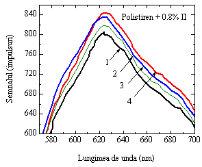 Spectrele de luminescenta in regiunea 570 - 700 nm ale senzorului de polistiren cu 0.8% pigment (II) la diferite presiuni. In figura din stanga sunt prezentate spectrele asa cum au fost inregistrate. In figura din dreapta este redat un detaliu in care se vede mai bine influenta presiunii de oxigen: 1 - 1atm; 2 - 0,6 atm; 3 - 0,4 atm; 4 - 0,02 atm |
