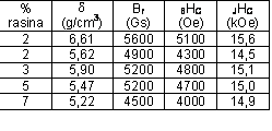 - S-au sintetizat trei serii de compozite magnetice rasina poliesterica nesaturata/Nd-Fe-B. Drept lianti s-au utilizat o rasina inalt reactiva, reticulabila chimic la cald sau la T ambianta. O rasina de reactivitate medie sau o rasina cu reactivitate marita la temperaturi ridicate. Inainte de utilizare, particulele metalice au fost supuse unor operatiuni de reducere a dimensiunilor (maruntire) in scopul asigurarii unei mai bune dispersari in rasina liant. Probele au fost caracterizate din punct de vedere al densitatii si al proprietatilor magnetice (tabelul 1) observandu-se scaderea proprietatilor magnetice utile cu cresterea continutului de rasina liant. Compozitele sintetizate se inscriu in randul materialelor magnetice dure, chiar si la concentratii relativ mari de liant (7%).