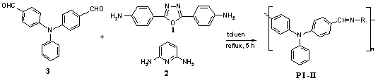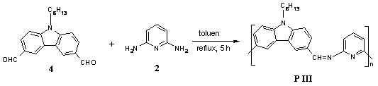 - S-au sintetizat poliimine avand in lantul principal atat grupe electronodonoare, de tip carbazol si trifenilamina, cat si grupe electronoacceptoare de tip piridina si oxadiazol, astfel incat transportul de sarcina sa fie bipolar, prin electroni si goluri. Polimerii au fost caracterizati structural folosind spectroscopia de IR, 1H-RMN, UV-VIS si fluorescenta iar masele moleculare au fost estimate prin RMN si GPC.