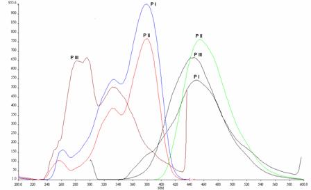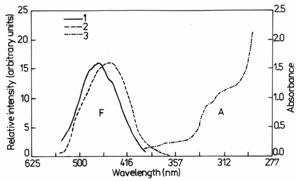 Spectrul de absorbtie al stilben-polimerului (3) si spectrele de fluorescenta (λexc = 334 si 365 nm) in film (1) si in solutie (2) |