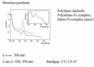 - Au fost obtinuti noi polisilani - poli(metilhidro-co-metilfenil sau difenil)silani, polisilani functionalizati cu grupari salicilideniminice - si complecsi metalici ai celor din urma. Ca urmare a conjugarii σ extinse, polisilanii prezinta proprietati fotoconductoare cu o banda de conductie de ordinul 4-5 eV. Prin complexare cu ioni metalici, banda de conductie electronica scade la cca. 2 eV, iar mecanismul conductiei de tip p (HTM), specific polisilanilor, se transforma in mecanism ambipolar, de tip (p-n) la polisilanii chelatati cu metale. Complexul metalic prin caracterul sau redox poate functiona asemeni unui releu electronic atunci cand materialul este in contact direct cu medii electroactive. Aceasta structura permite ajustari ulterioare prin modificarea naturii substituentilor, a cationilor metalici, a dimensiunii puntii de cuplare.