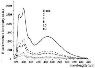 Evolutia spectrului de fluorescenta a filmului polimeric la timpi diferiti de expunere la vapori saturati de nitrobenzen (λexc = 344 nm) |